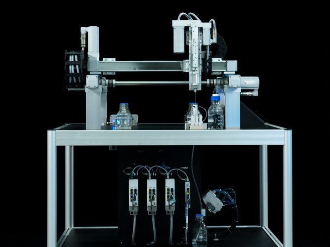 本次展会,Festo带来了全球首发的大容量移液门架系统。该系统由Festo高性能电缸ELGD、紧凑型滑台EGSC、高性能伺服电机EMMT-AS、直流伺服EMMT-EC及移液注射器组成,适用于100ul到50ml全范围样本处理,检测人员将与样本“零接触”,有效降低预处理工作量,减少人员操作失误带来的影响。Festo还展出微孔板洗板机解决方案用于清洗酶标板检测后的一些残留物质,以保证检测的准确性和可靠性。