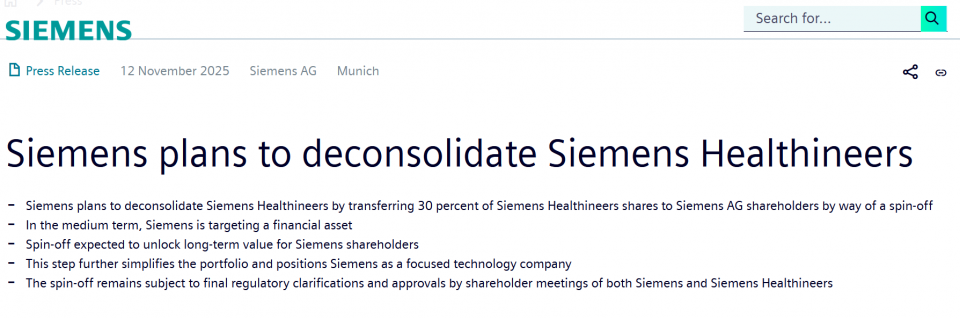 西门子宣布,拟对其目前持有约67%股份的西门子医疗进行去并表操作。公司计划将30%的西门子医疗股份通过直接分拆的方式转让给西门子股东,使股东可直接持有西门子医疗股份。从中期来看,西门子计划将其在西门子医疗的持股降至金融资产级别。该举措将进一步简化集团业务组合,将西门子定位为一家专注型技术公司。分拆方案尚未获得监管部门最终批准,以及西门子与西门子医疗两家公司股东大会批准。